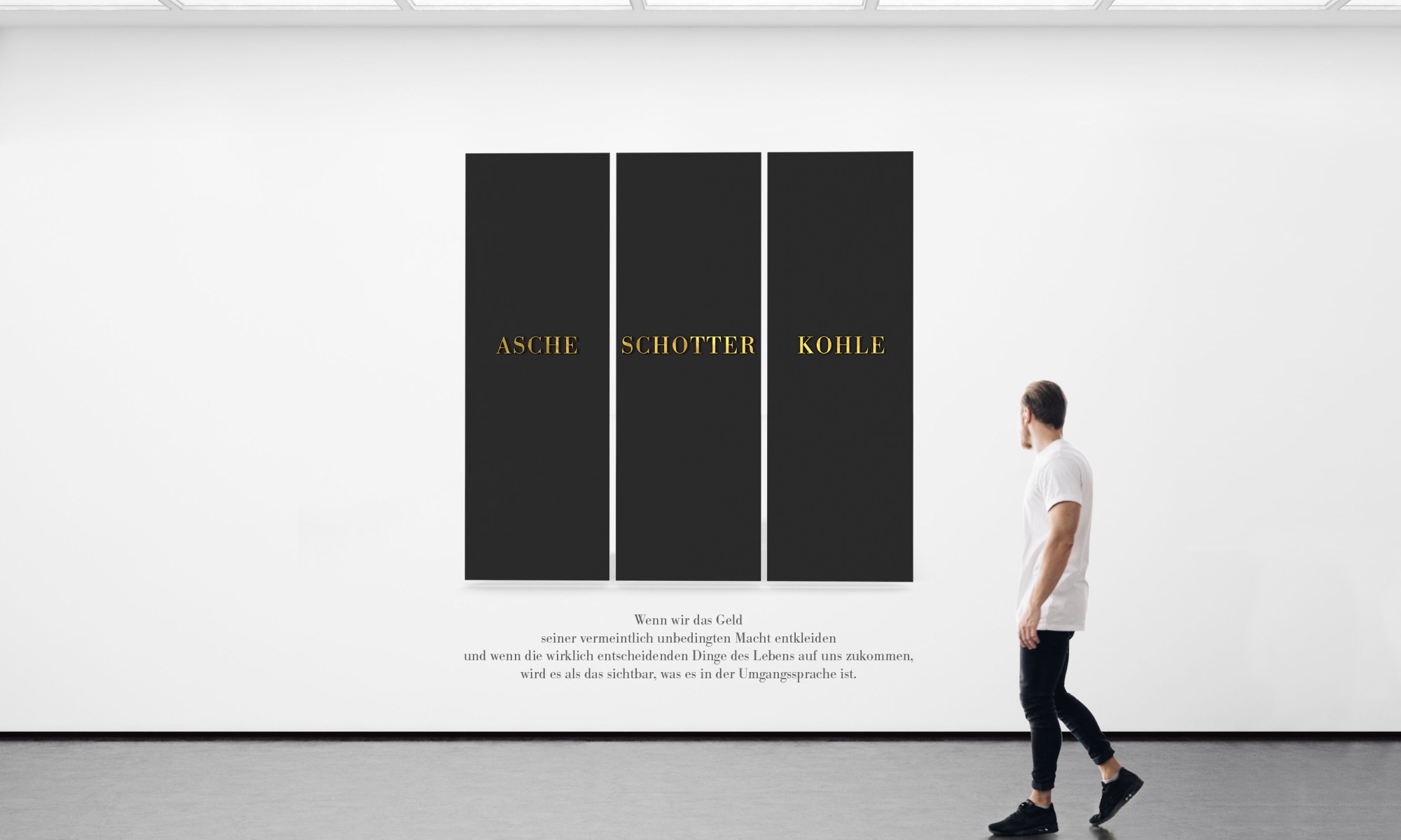 ”Wenn wir das Geld seiner vermeintlich unbedingten Macht entkleiden und wenn die wirklich entscheidenden Dinge des Lebens auf uns zukommen, wird es als das sichtbar, was es in der Umgangssprache ist. NICHTS." Tryptichon Format: je 800x800 mm Material: Holzuntergrund, Schichten aus Acryl mit Kohle, Kies und Aschepartikeln erhabene Messingtypografie